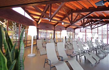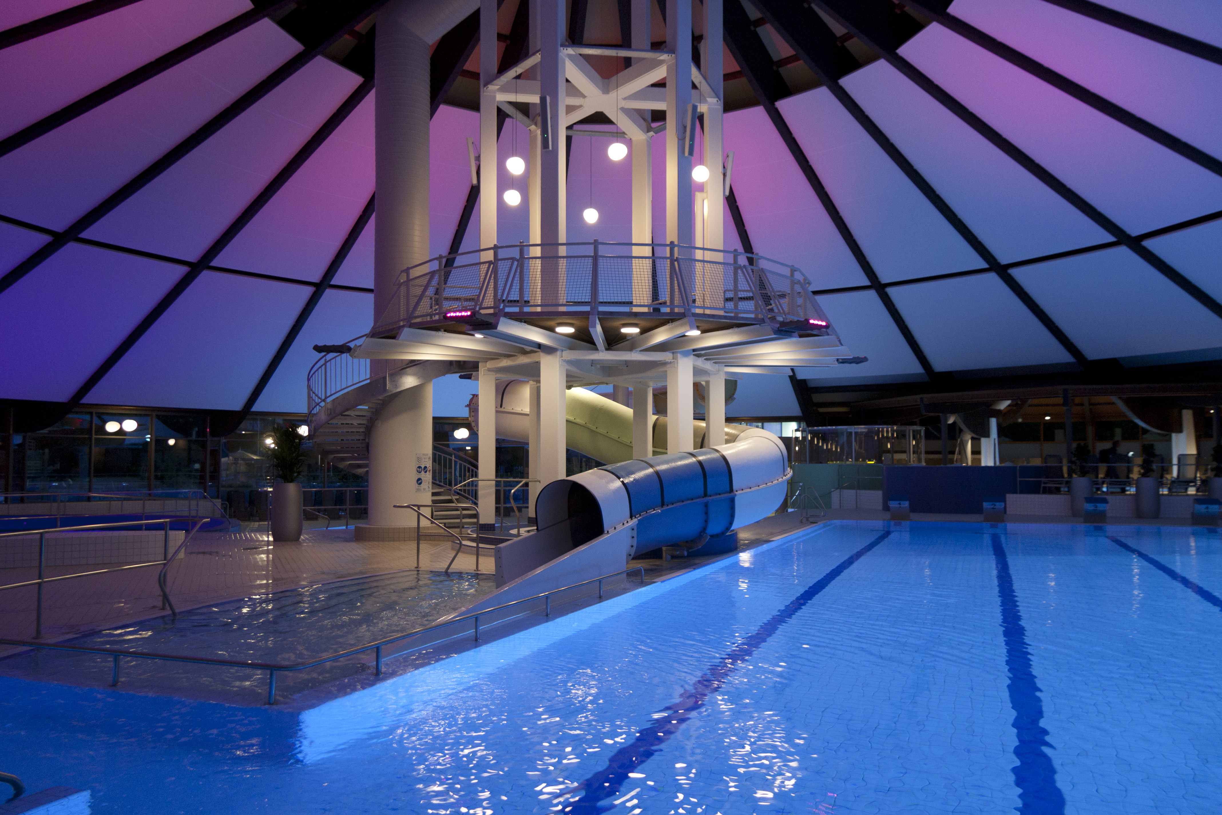 In die Dachsegmente wurden Spezialmembranen mit hohem Reflexionsgrad eingebracht. Diese werden zur Allgemeinbeleuchtung des Badebereiches mit LED-Scheinwerfern angestrahlt.