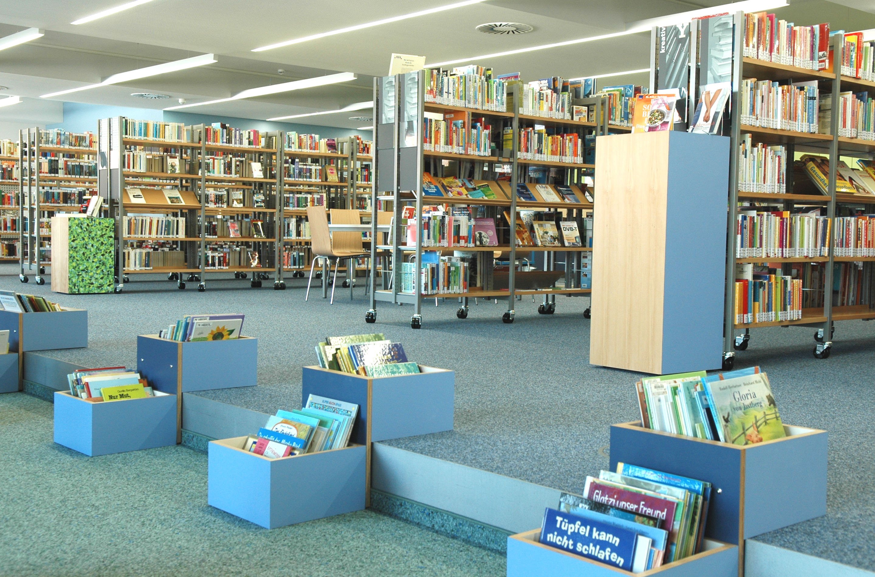 Die 450 qm große Fläche wurde sinnvoll zoniert in die Bereiche Entleihe mit Selbstverbuchung, Verwaltungsbüro, Kinder- und Jugendbücherei, Zeitschriften-Lesezone als "Cafeteria" und allgemeine Bücherei.