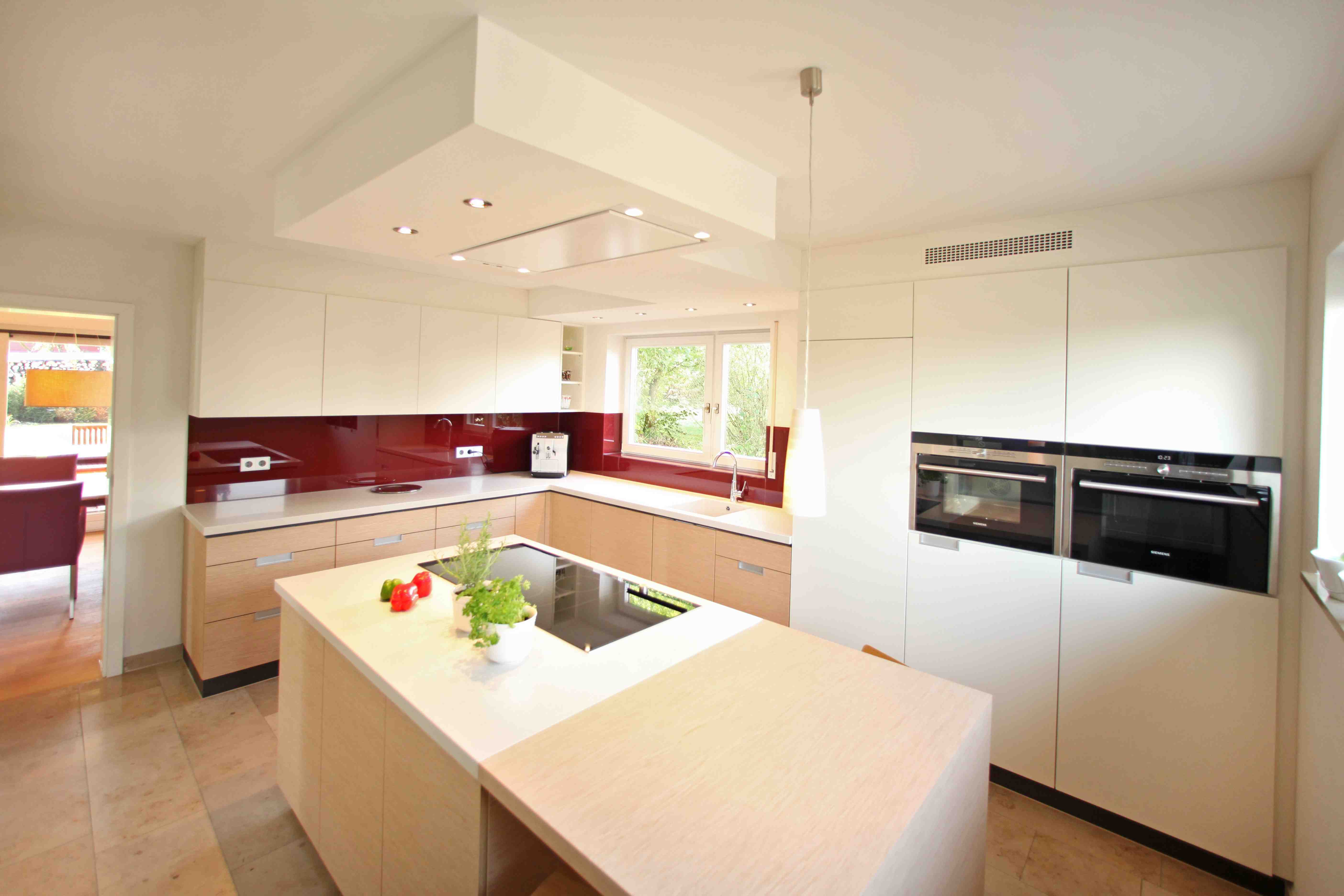 Eine weiße Akustik-Spanndecke kombiniert mit Sonderleuchten (Konzept/Herstellung: thomashubertlicht) ermöglicht optimale Lichtverhältnisse.