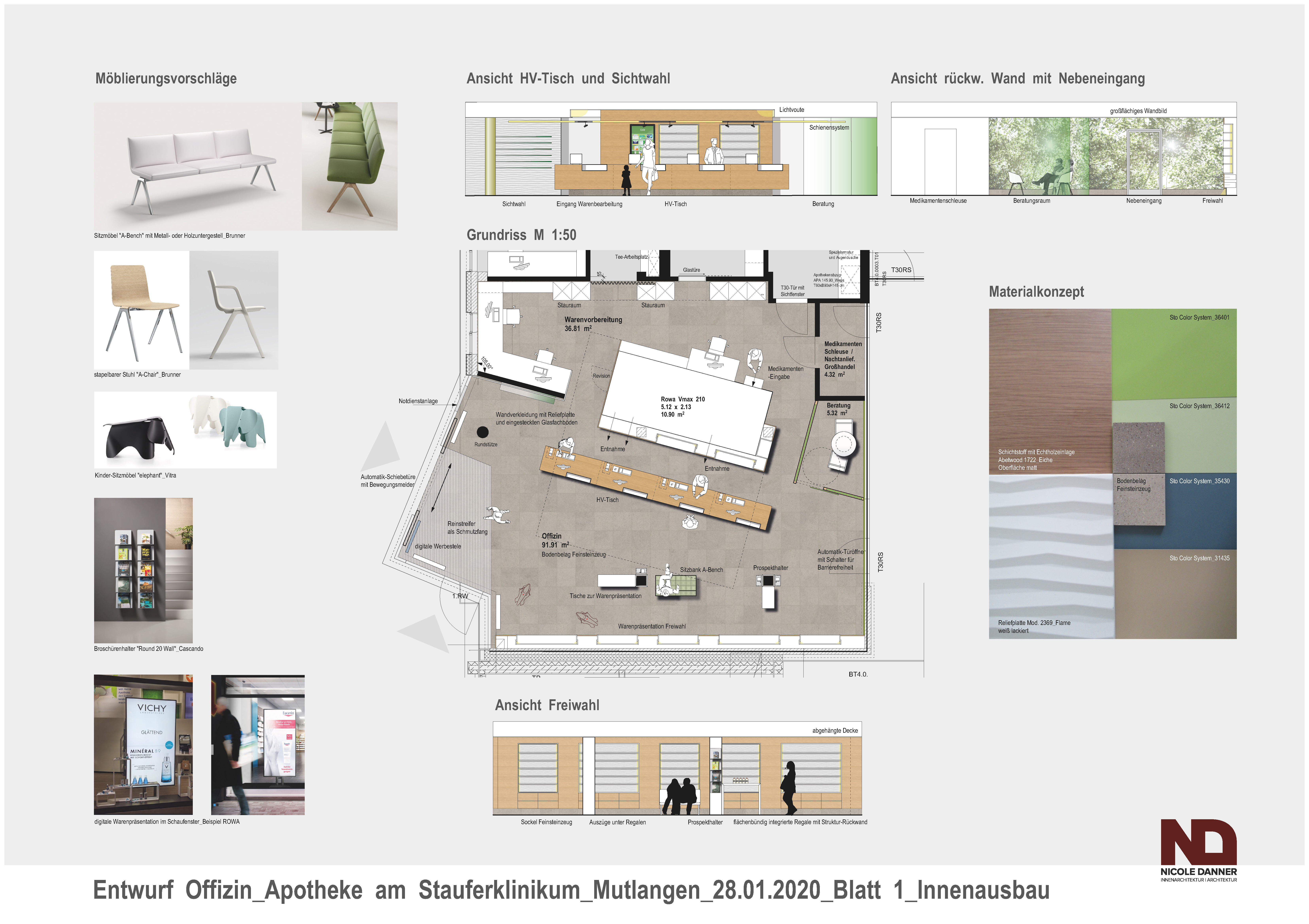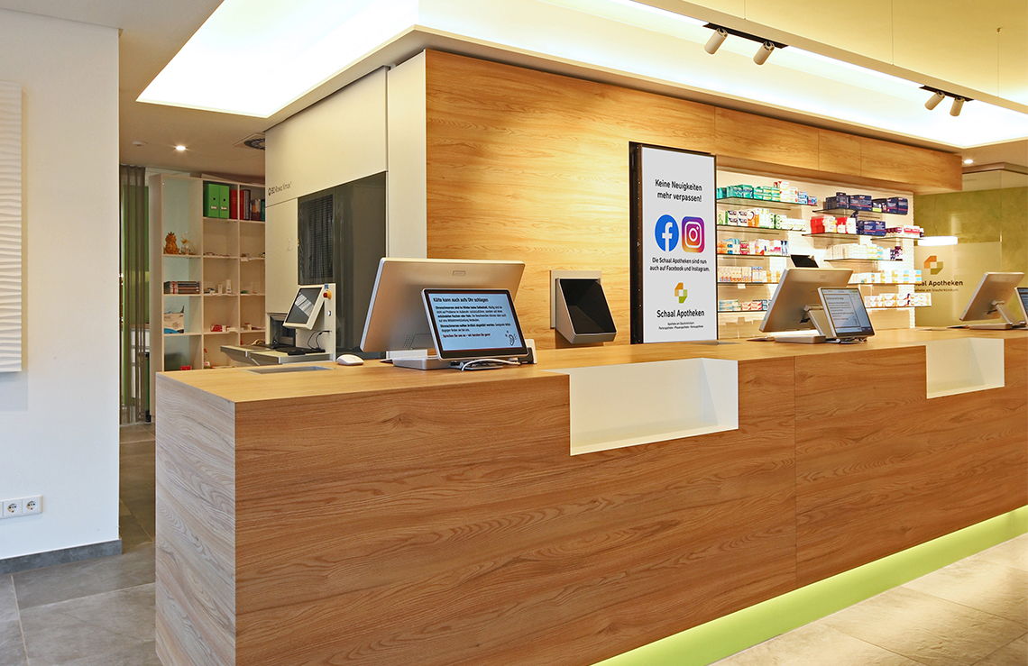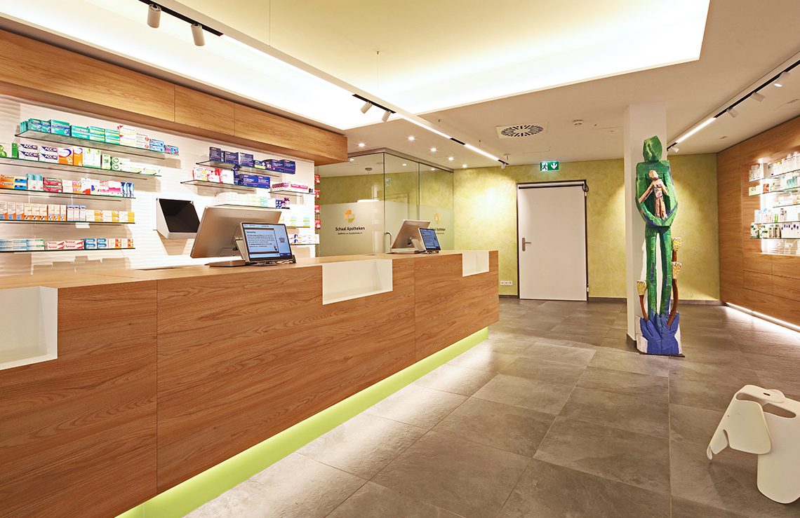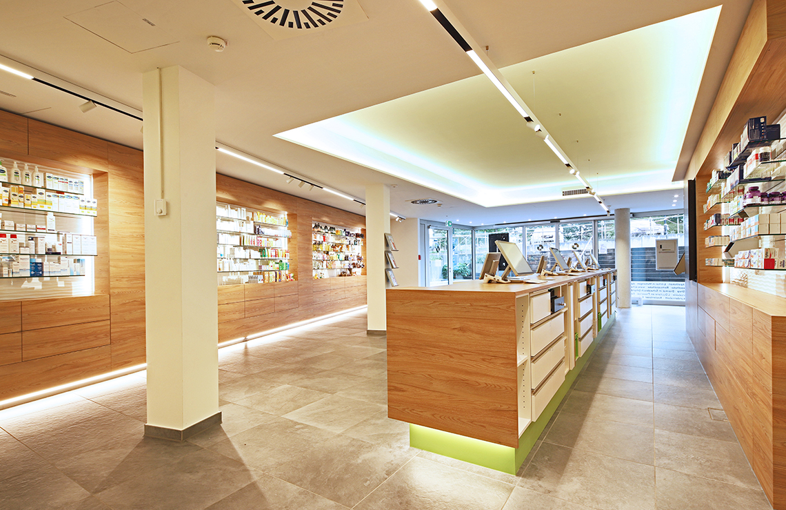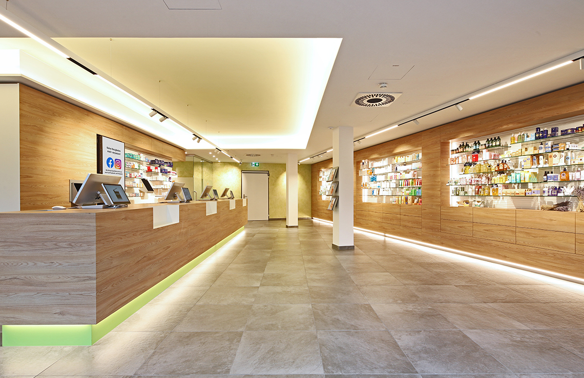 Ein ausgefeiltes Lichtkonzept und die subtile Farbgebung der Innenausbauten gleichen die räumliche Lage im Untergeschoss aus, denn ein Großteil der circa 220 m² Gesamtfläche ist ohne natürliche Belichtung. Dem Schallschutz am Arbeitsplatz und der Diskretion bei der Beratung der Kunden am HV-Tisch wurde besondere Rechnung getragen mit dem Einsatz hochabsorbierender Abhang-Deckensysteme. Die harmonische Verbindung von topmoderner Apothekentechnik und einem Ambiente zum Wohlfühlen macht gleichermaßen Mitarbeiter*innen und Kund*innen Freude.
